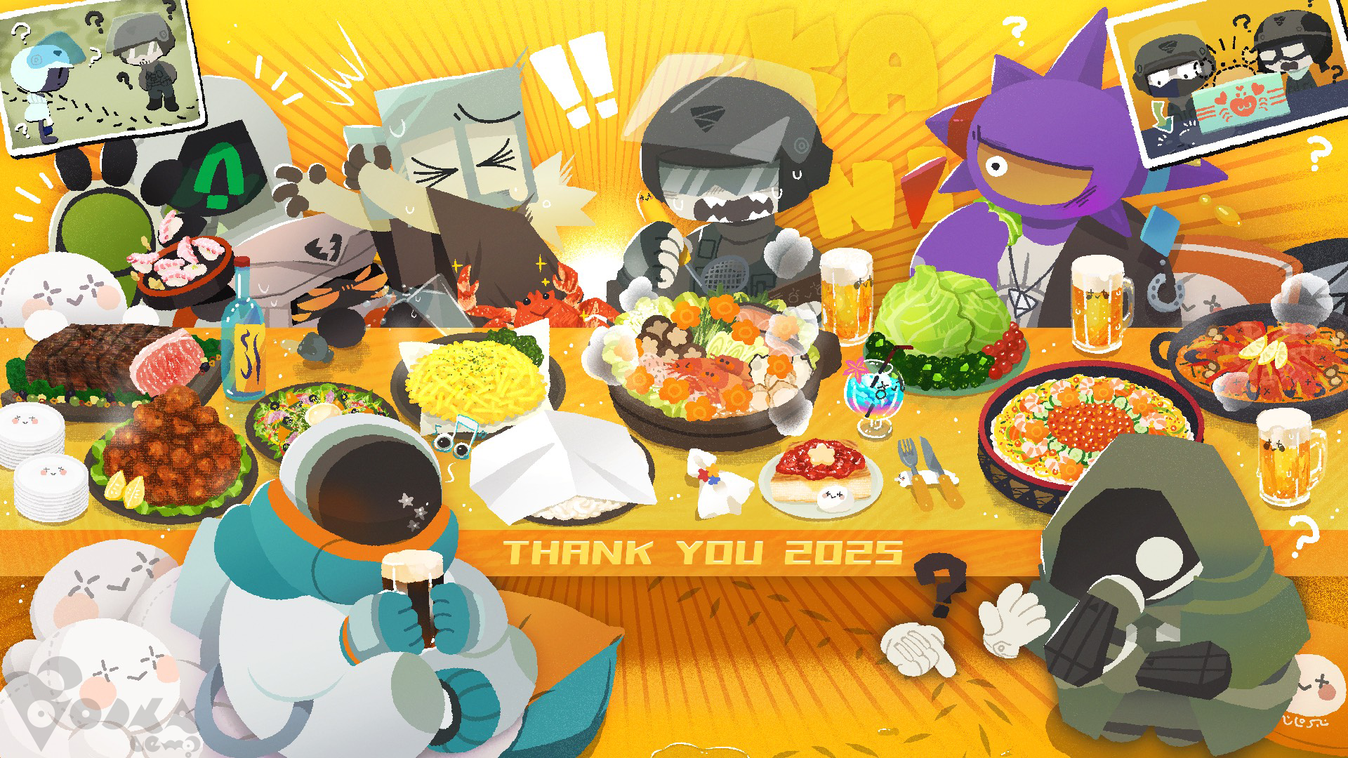 年明けの休日を楽しむブラッディパエリアの面々です。卓に載せられたのは唐辛子が沢山浮いた激辛火鍋&星型お野菜のミルクチーズ鍋! 鍋が煮えるまでの時間を思い思いに過ごす ギャングたちを描いていただきました。一方のデスブイヨンは、それぞれにマイペースなお正月を過ごしている様子。