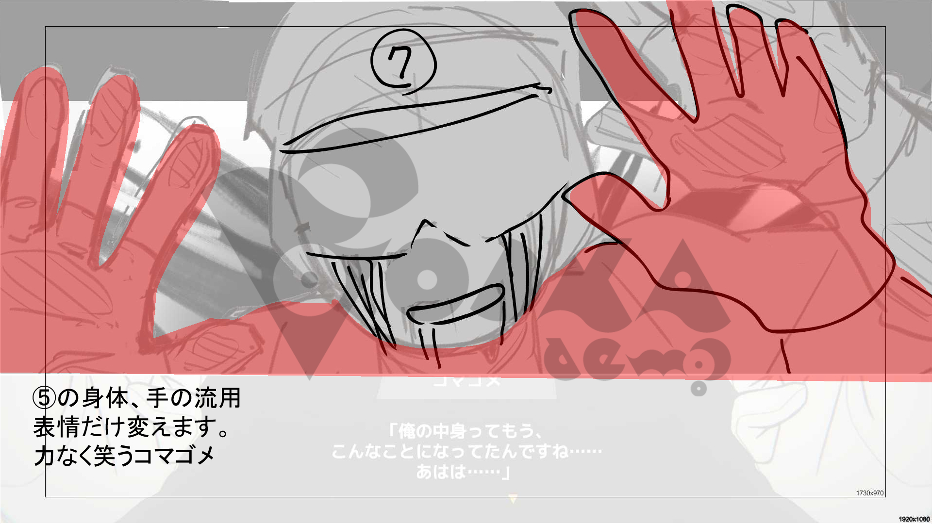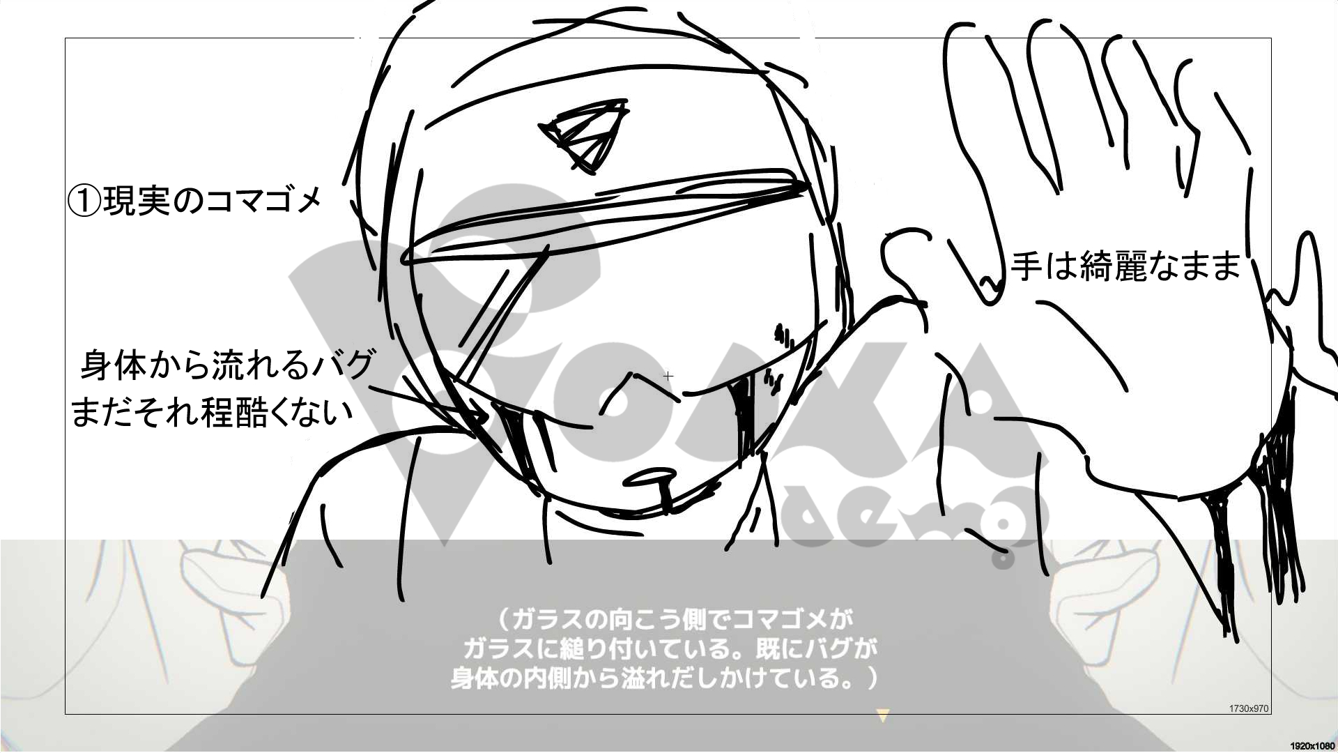 コマゴメがストーリー上でバグに侵されることは当初から決定されていたのですが、当該のシーンがどのような演出になるかはしばらく未定でした。