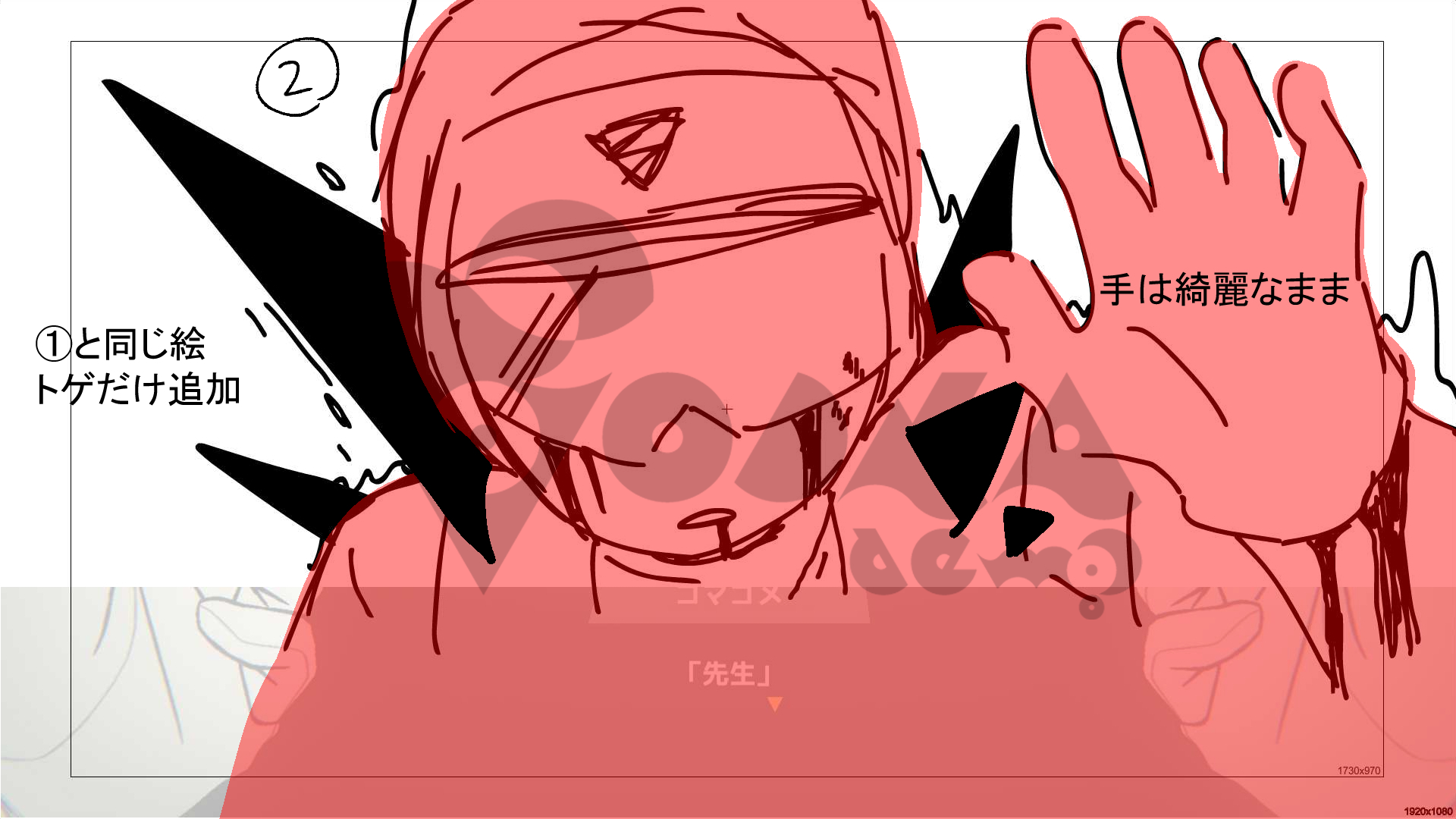 魔王ルートのクライマックスシーンは、アートアシスタントのGuraiさんのご助力を得て制作されています。上記のアイデアを取り入れながらアートスタッフのホでヴがGuraiさんにお渡しした指示書がこちら。