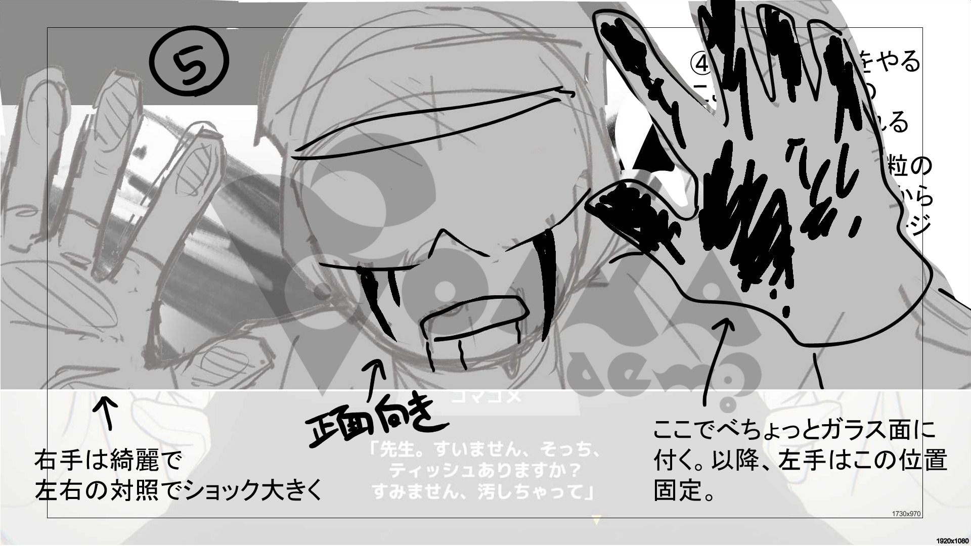 気まぐれで描かれた絵だったのですが、「生死を彷徨う状況でティッシュを求める」という何ともいえない間の抜け方がいかにも彼らしい感じがしてチーム内で好評となり、実際の演出に取り入れられることが決定しました。