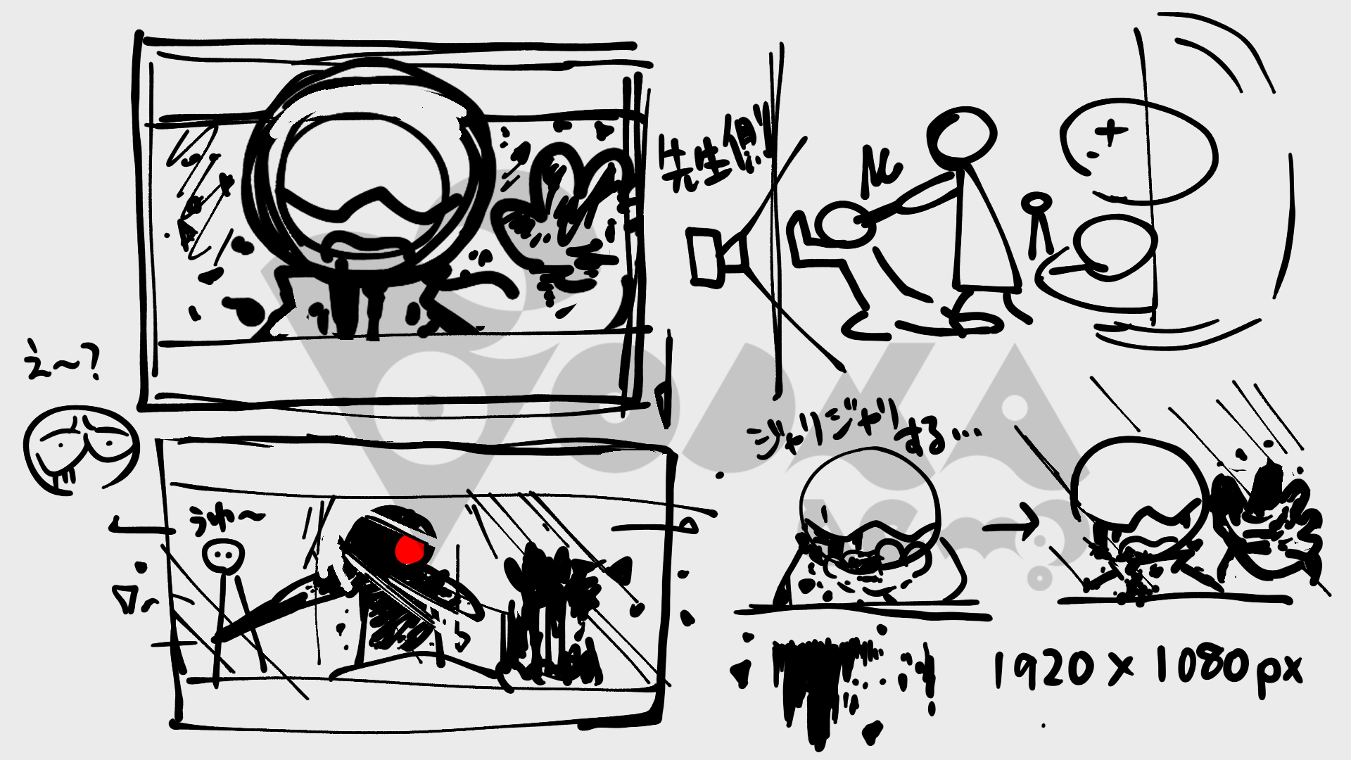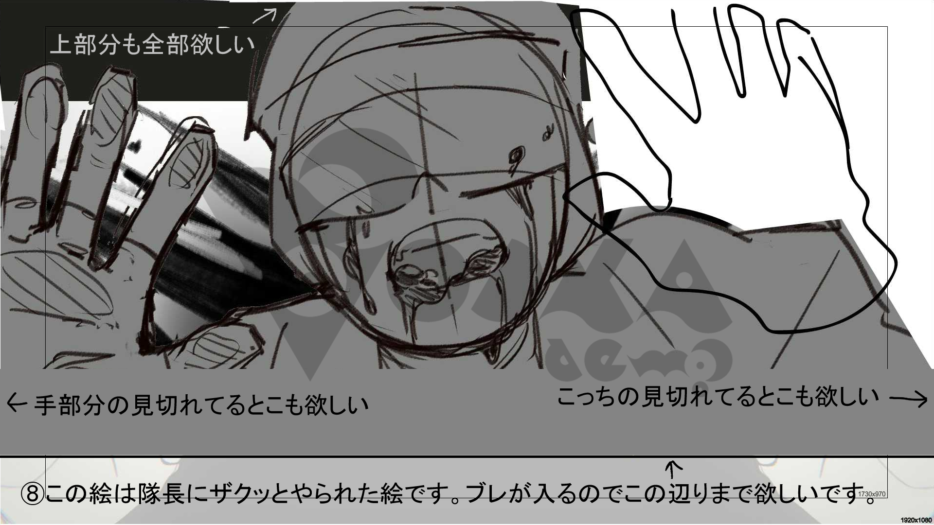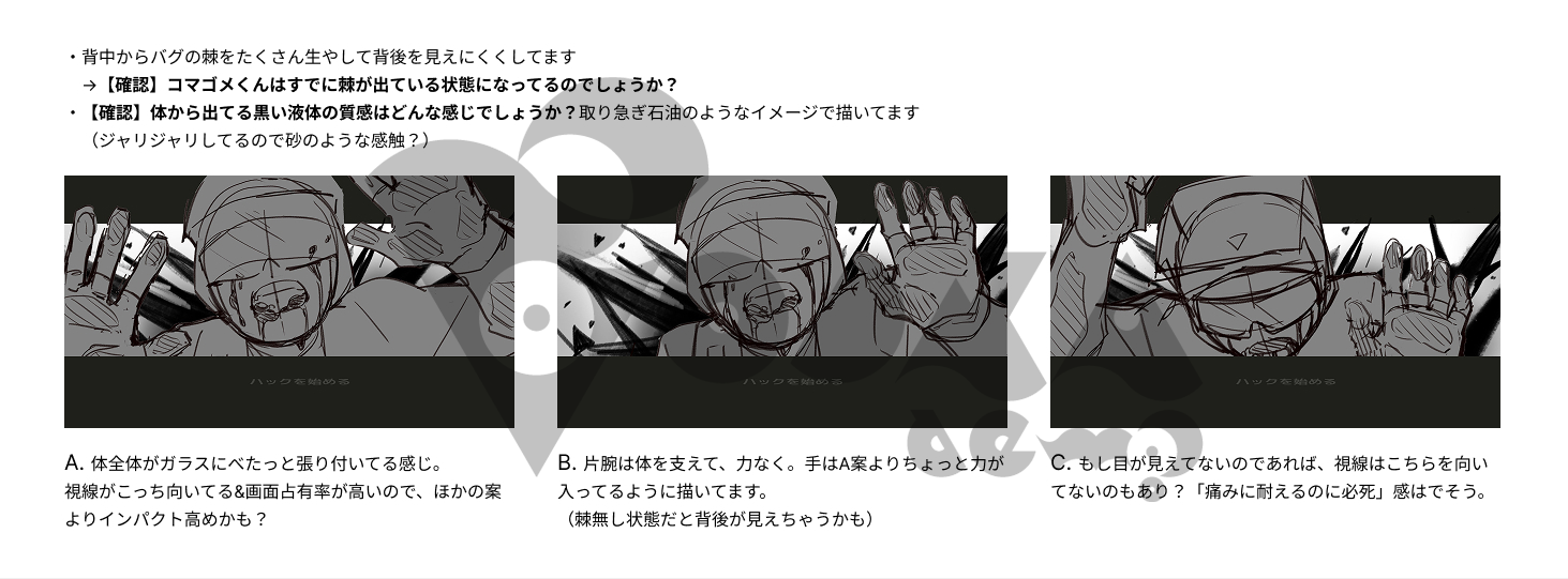 Guraiさんの素晴らしい解釈により、とても迫力のある構図が仕上がってきました! A~Cのバリエーションを提案していただき、ホでヴが実際に流れを組み込んだラフが次のようなかたちです。